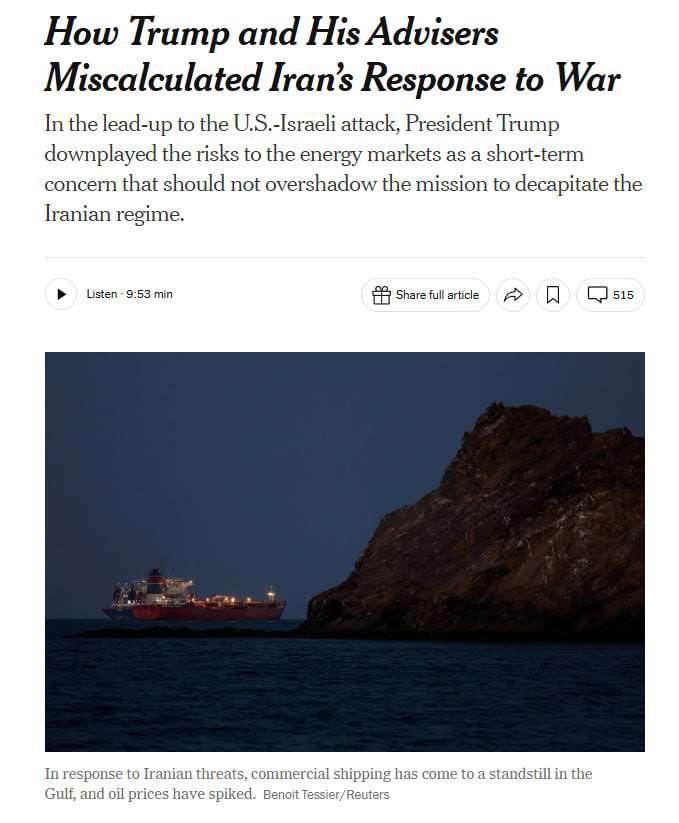 🇺🇸🇮🇷 Before launching strikes on Iran, Trump and several advisers believed the war would have little impact on global oil markets and expected any price increases to be brief, according to NYT.