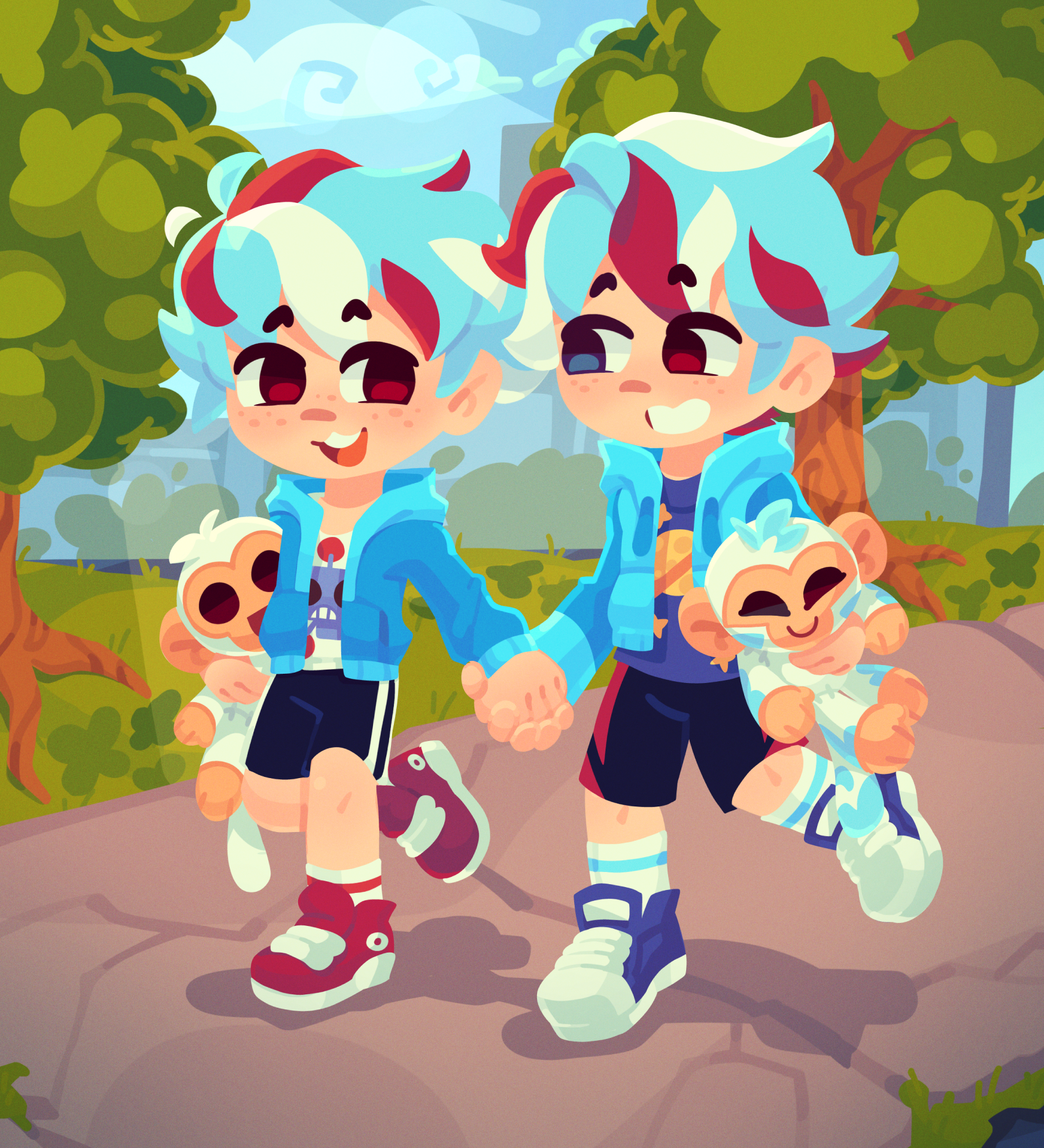 Aww, cute twins with their matching plushies.