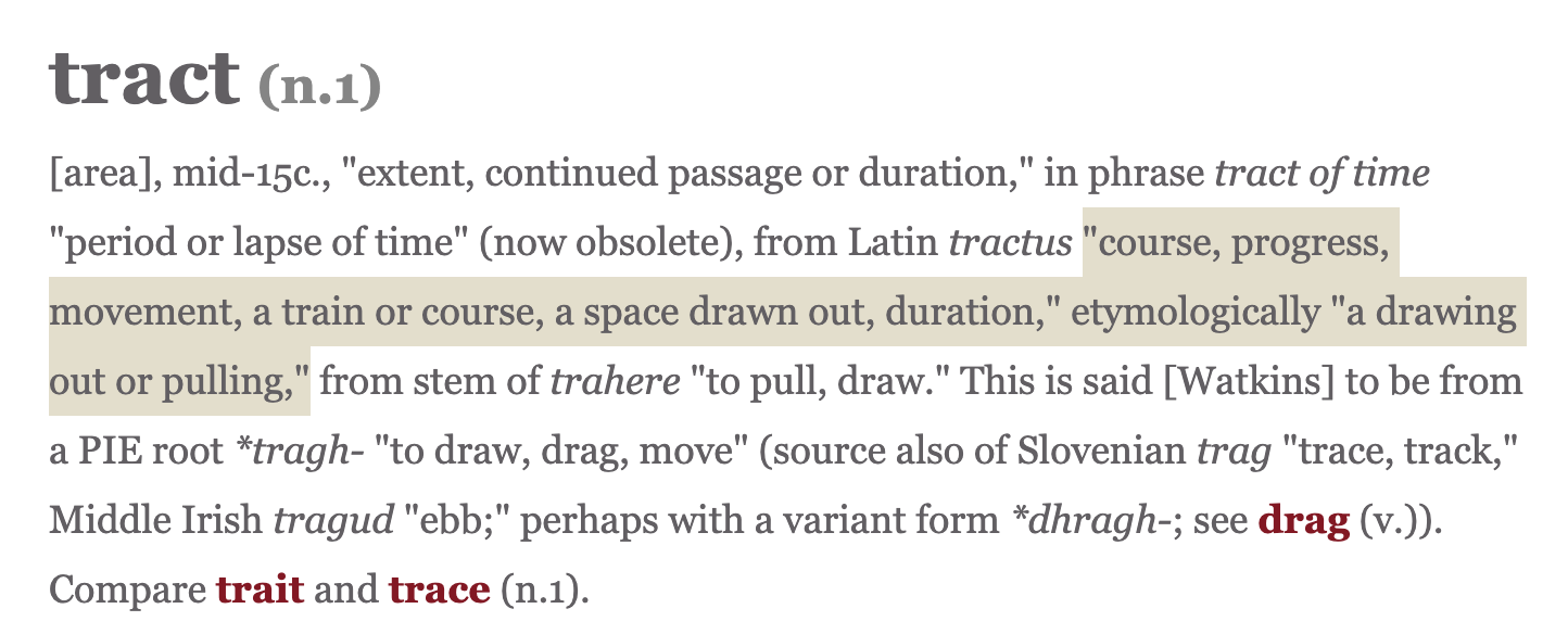 ![tract(n.1) [area], mid-15c., "extent, continued passage or duration," in phrase tract of time "period or lapse of time" (now obsolete), from Latin tractus "course, progress, movement, a train or course, a space drawn out, duration," etymologically "a drawing out or pulling," from stem of trahere "to pull, draw." This is said [Watkins] to be from a PIE root *tragh- "to draw, drag, move" (source also of Slovenian trag "trace, track," Middle Irish tragud "ebb;" perhaps with a variant form *dhragh-; see drag (v.)). Compare trait and trace (n.1). The meaning "territory, region of indefinite extent, stretch of land or water" in English is recorded by 1550s. Latin tractus also had a sense of "territory, district, region of land." The specific U.S. sense of "plot of land for development" is recorded from 1912; tract housing is attested by 1953. Also by 1680s in anatomy, in reference to regions of the body having particular functions (digestive, respiratory, etc.). also from mid-15c. tract(n.2) "little book on a particular topic, short treatise" late Old English tracte, probably a shortened form of Latin tractatus "a handling, treatise, treatment," from tractare "to handle" (see treat (v.)). Also in liturgy, an anthem consisting of verses of Scripture used at certain occasions. In later use, "a short pamphlet" (by 1806). Related: Tractarian.](